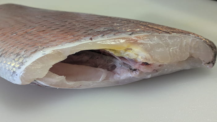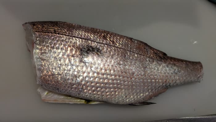 皮肌が空気に触れて酸化するのを防ぐため、鱗は取っていません。